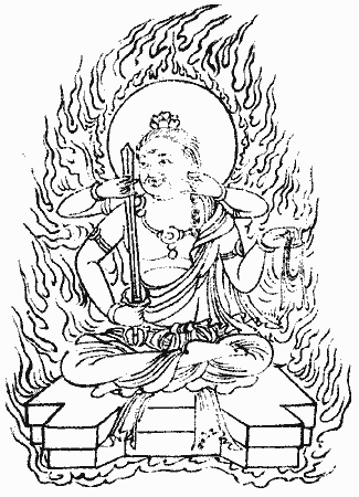 四臂不動忿怒王(菩薩)Aryaacalana^tha,梵名阿遮羅曩他。譯言不動尊,又翻無動尊。又阿奢囉逝吒Acalacet!a,亦謂之不動使者。密教諸尊,依三輪身之分類而總判之:則大日如來為一切諸尊之總體,為自性輪身,而此尊為一切諸佛之教令輪身。故又稱為諸明王之王,五大明王之主尊。在密教諸尊中與大日如來相並,享多數之祭祀。約金胎兩部,而分別其德,則五方之五佛各有三輪身:中央者毗盧遮那如來,為自性輪身,金剛波羅蜜多菩薩為正法輪身,不動明王為教令輪身。是奉大日如來教令示現忿怒形,降伏一切惡魔,有大威勢之真言王也。又稱明王,明王者與稱真言王同(是約於金剛界,見教令輪身條)。又,此尊於大日華臺雖久已成佛,而以其本誓之故,現初發心之形,為如來之童僕而給使諸務,且給使於真言行者,故稱使者。使者即使役於人之義也。不動使者,不動即使者而非不動者,不動之使者如二童子,八大童子等(是約於胎藏界)。大疏五曰:「此尊於大日華臺久已成佛,以三昧耶本誓願故,示現初發大心諸相不備之形,為如來僮僕給使,執作諸務。」立印軌曰:「無動尊現身奉事修行者,猶如婆