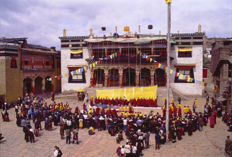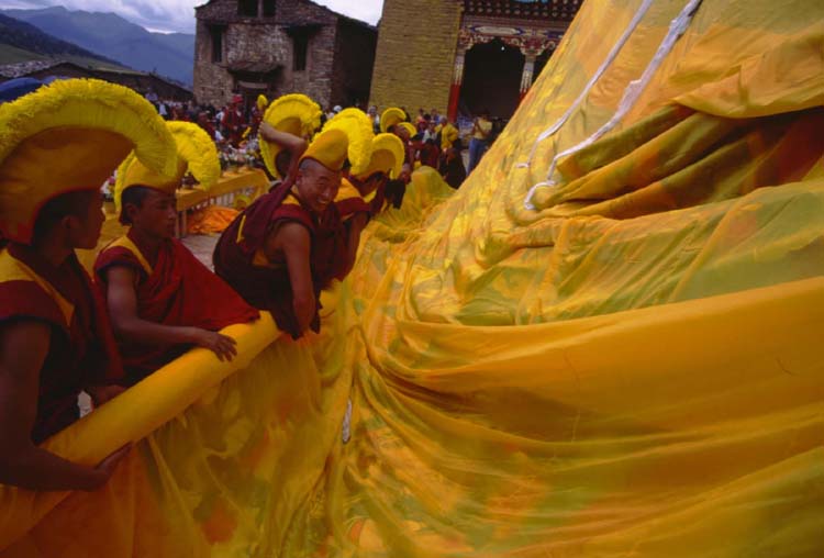 曬大佛所用的佛畫都屬於寺院的珍藏品,只會在特定的日子,聚集數以萬計的信眾及穿著整齊僧袍的僧眾,在十分莊嚴的氣氛下,奏著藏族佛教音樂及鐘鼓齊鳴的法會中被請出來展示﹔請出佛畫往往要動用上數十位強壯僧人,掛佛畫及展開的程序有時更會動用到上百人才能順利完成﹔一旦佛畫展開了,全體會恭敬禮拜三次,然後在佛曲伴奏下唱頌佛經及各種禮讚文達數小時之久。最後,佛畫會被重新捲起捧回殿內收藏,直至翌年同日方會再度移出戶外展示。