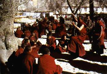 <在格律派各大寺院內,僧人自年幼起就要開始學習辯經,透過辯論來學習及引証所聞學的佛法。