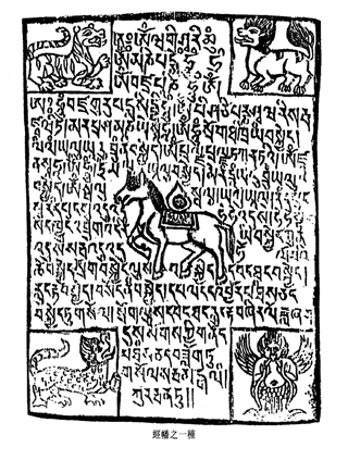 、藍色表不動佛與風大及白色表毗盧遮那佛及空大。此外,五色也代表了五佛智及五蘊。在有些經幡中,四角會印有四瑞獸及三降諍獸(註:見另文)的形相或名字。四瑞獸中的大鵬代表智慧、龍代表力量、獅代表無畏喜、虎代表信心。三降諍獸則表義和合共處的精神。