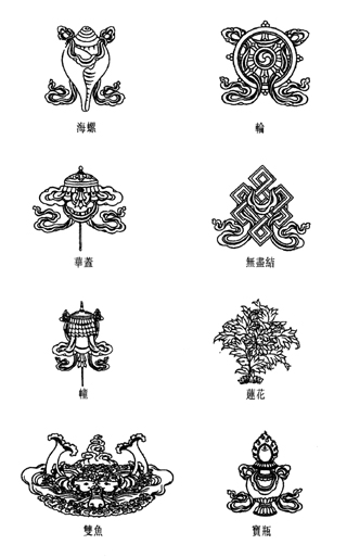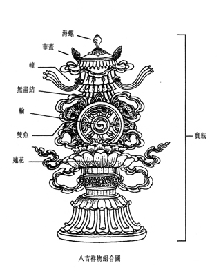 寶瓶──它一般被繪為平口、圓身、幼頸及頂端外彎,表義源源不盡的財富。這 所說的財富當然不狹指世間錢財,同時也包含了佛法上的「財富」。