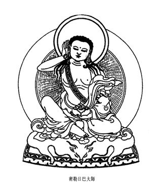 密勒日巴的形相,在後世多繪為身泛綠色、披白色棉布的長髮體瘦苦行相。