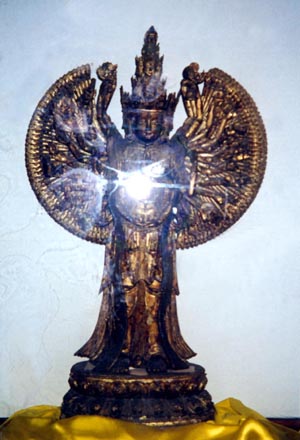 寺院均屬漢傳佛教,但卻有不少藏族佛子遠道而來,目的只為朝禮這一尊觀音。這尊觀音由於年代久遠,銅鏽斑斑,但仍看得出其手工精美過人。最殊勝之處乃觀音像身上自然流出甘露,長年不絕。據寺中老僧口述,最初是1989年發現此聖像流出甘露,把像下之綢緞都沾濕了。據寺中猜測,此觀音像或許一向有甘露流出,只是一向未有人留意。在1989年,由於甘露流出極多,才被人發現這奇異之現像。在頂峰時期,甘露流遍整個小殿的地面,令人驚嘆不已。在前幾年,此聖像又曾放光,為多人所親見。筆者在這三年來,曾多次朝禮法源寺千手觀音,均見的確有甘露自其像身溢出。