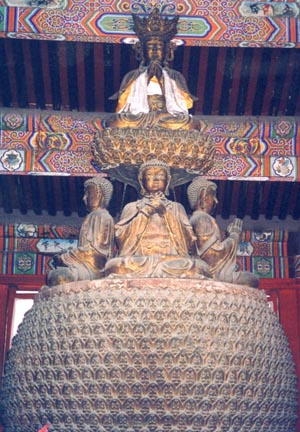 在法源寺毗盧殿中,供有一座明代佛像,其造型布排在一般寺院中少見:高約五米,頂上為毗盧遮那佛,中層為東方妙喜淨土的不動佛、南方歡喜世界寶生佛、西方極樂淨土彌陀佛及北方蓮華世界不空成就佛﹔下層千葉蓮瓣座,每一瓣上都有一佛,故共有千尊小佛。