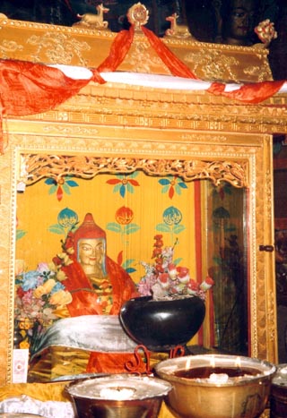 在殿外的走廊上,有兩座白色的佛塔,其中一座供有阿底峽大師的袈裟,另一座內藏松頓巴大師(阿底峽大師的心子)的衣袍。