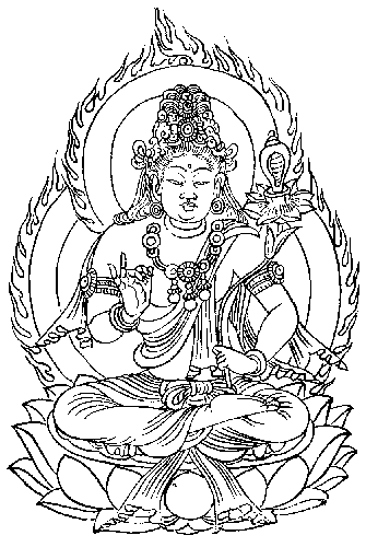(菩薩)胎藏界釋迦院釋尊之右第五位。密號曰妙響金剛。主說法之德。或有無邊音聲,無邊聲,妙音,遍昭(遍聲之意)之名。黃色,左手持蓮,上有法螺。右手立無名小三指(無名小三指五字,疑有誤,今仍之),餘二指屈而當胸,坐於赤蓮。