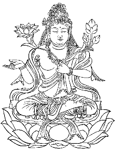 (菩薩)胎藏界觀音院第三行第三位之尊。譯之為「豐財」。又其密號稱為如意金剛,由於其所司掌的是福 德的二門,並施與一切眾生,因此名之為豐財。此尊住於胎藏界曼荼羅觀音院第三行的第三位,其法相在「祕藏記」有云:「白肉色而左手執蓮華,其身旁有使者執蓮華。」左手持二莖蓮花,其一為未敷蓮約三房,伸出左肩上,另一為開敷蓮,伸出右肩上,此即顯示生佛不二之理者。至於其右手,則彎曲無名指、小指兩指,立起其 餘各指,作成如「力印」,舉至肩下,穿上天衣,生於赤蓮之上。